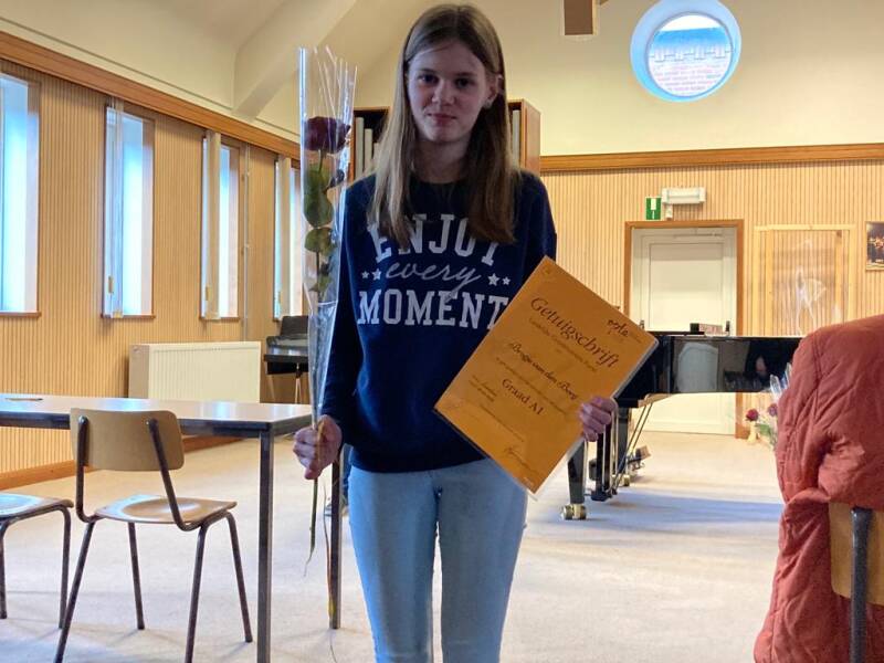 Ook dit jaar hebben drie leerlingen een graadexamen gedaan. Ze hebben alle drie hun programma van ongeveer 5 stukken heel muzikaal gespeeld. Daarnaast waren de technische oefeningen ook prima uitgevoerd en het theorie- examen werd met dikke negens en een 10 afgesloten. Proficiat, Ymke, Bregje en Jorien!